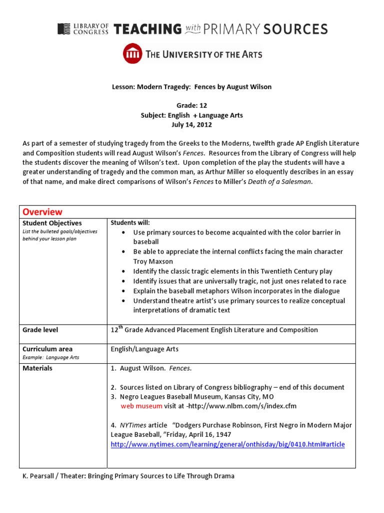 The story Fences by August Wilson brings forth the plight of one family living in a black tenement in Pittsburgh, Pennsylvania in the late 1950s Students may need to read and review the play at home. They may also be required to search for music lyrics that fit the images. ... Access Full Source
